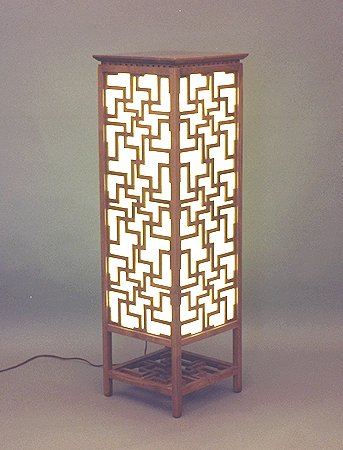 The latticework floor lamp contains fluorescent tubes and has two settings. The 100 percent wool cloth used for diffusion is sandwiched between glass so that it will stay clean and not be subject to decay. (The eight panes of glass make this piece rather heavy.)