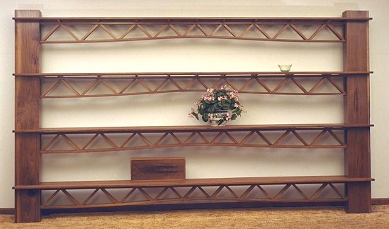 This bookcase is laminated in the style of aircraft spars and, like aircraft spars, it is light and very strong. It holds a full measure of books with a minimum of beam deflection. The shelves can be pulled from the uprights, making the bookshelf easier to move.