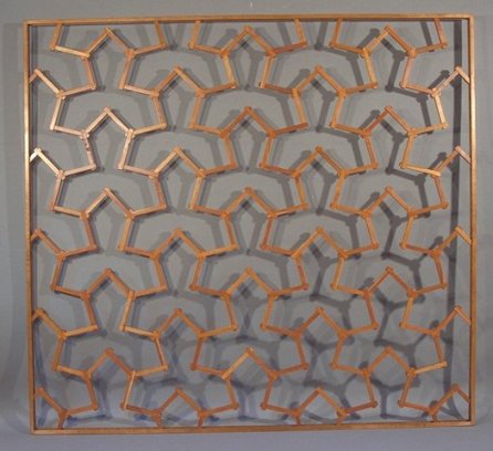 This piece is a large, open lattice made up of three repeating geometric figures. It can be suspended from a ceiling. When supended it casts beautiful shadows on the ceiling when illuminated from below.