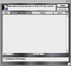 - If you haven't already, launch Media Cleaner Pro v3.1. If you are given the choice, then select advanced settings. Otherwise, advanced setttings will be selected automatically and you should see the following window after Media Cleaner Pro has launched.
