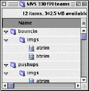 You should organize each team's "atrim" and "btrim" movies into an "imgs" folder within the team folder named according to each team's name. For example, for the "MVS 330 f99 teams," the file structure would look similar to the screen shot below. The teams pictured include "bouncin" and "pushups."
