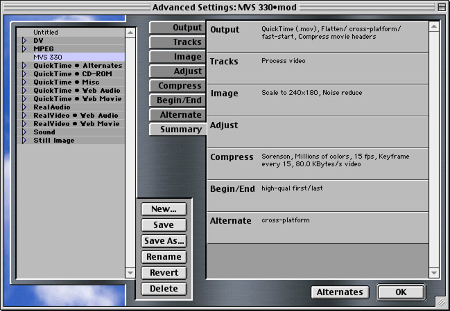 You will need to download the"MVS 330" settings file which contains the specific settings required for the MVS 330 project movies. Locate the "Media Cleaner Settings" folder within the Media Cleaner Pro folder. Download the "MVS 330" settings file now and place it in the "Media Cleaner Settings" folder. Now you are ready to launch Media Cleaner Pro v3.1 and begin compressing movies.