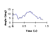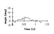 Segment angle. The absolute angle of the trunk was analyzed for one complete gait cycle in both the able-bodied gait and the amputee gait. The amputee trunk showed a greater range of motion (10 deg) than that of the able-bodied trunk (6 deg). The amputee trunk had a minimum angle of 3 degrees (at the second heel strike) and a maximum angle of 13 degrees (during early swing phase). The able-bodied trunk had a minimum angle of -1 degrees (at foot flat) and a maximum angle of 5 degrees (during early swing phase).