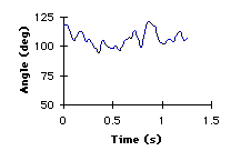 Figure 4. Ankle joint angles in the able-bodied gait (left) and the amputee gait (right). The ankle joint angles were calculated as the angle between the shank segment and the foot segment. The anatomical position of the ankle joint is approximately 110 degrees for able bodied gait and approximately 75 degrees for the amputee gait. In able bodied gait, an ankle angle less than 110 degrees represents dorsiflexion whereas an angle greater than 110 degrees represent plantarflexion. In amputee gait, an ankle angle less than 75 degrees represents dorsiflexion whereas an angle greater than 75 degrees represent plantarflexion. | |