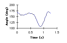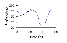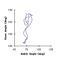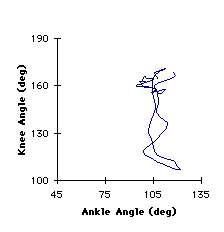 Angle-Angle Plot. The coordination of the knee and ankle joints was quite similar. The majority of the motion occurred at the knee joints. When the ankles did move, they were coupled with knee movements. Increasing knee angles represented extension while decreasing knee angles represented flexion. In the able-bodied gait, ankle angles greater than 110 degrees represented plantarflexion while ankle angles less than 110 degrees represented dorsiflexion. In amputee gait, ankle angles less than 75 degrees represents dorsiflexion whereas ankle angles greater than 75 degrees represent plantarflexion. When the knee joint was at its greatest flexion, just after toe off, the able-bodied ankle plantarflexed. At that same position in the gait cycle, that amputee ankle remained dorsiflexed. Additionally, the amputee ankle exhibited greater plantarflexed from heel strike to foot flat.
