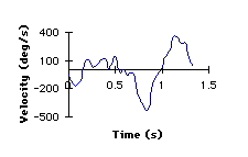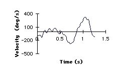 Joint velocity. The angular velocity for knee joint was analyzed for one complete gait cycle in both movements. While the peak flexor angular velocity in the able-bodied gait was only 270 degrees per second, it was 429 degrees per second in the amputee gait. The peak extensor angular velocity was similar for both the able-bodied gait (324 degrees per second) and the amputee gait (357 degrees per second).