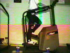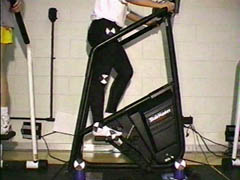 There are currently two popular stair-climbing fitness machines in use in the CCRB, the University of Michigan's student fitness facility, as well as numerous other gyms. They are the StairMaster and the LifeStep. The StairMaster is constructed of two small foot pedals, which are attached to a chain, and requires constant movement in order to keep the pedals from coming in contact with the floor. In contrast, the LifeStep has larger foot pedals and the resistance is controlled by hydraulic pumps. The main difference in construction between the two is that the LifeStep doesn't require the user to be in constant motion. The movement of one pedal is dependent upon the movement of the opposite pedal, and the relationship of their movement is inverse. We would like to study the differences in the human kinesiology between the two machines. There appears to be a more extreme knee angle and ankle range of motion with the LifeStep. A more extreme knee angle would put an added stress on the patellar tendon due to the contraction of the quadriceps and the pulling of the patella towards the femur. A person with arthritis and chondromalacia may notice more pain and discomfort with use of the stair-climbing machine with the more extreme knee angle. It is proven safe for an individual with arthritic conditions to perform moderate level exercise on such a machine as a stairclimber. It is often known to lead to some relief of pain and disability (Ettinger, 1998). We would like to evaluate the how the LifeStep knee angles compare to the Stairmaster knee angles in order to see which model of machine is better suited for someone with knee injuries and pathologies.
