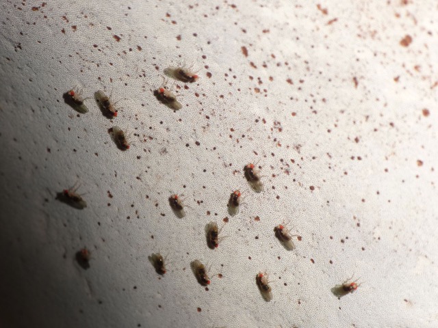 fruit flies aggregating on the surface of a Ganoderma mushroom