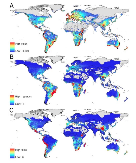 Figure 2 of Rödder et al. 2009. A). Species Distribution Model showing the potential distribution of Bd based on existing occurrence data and climate variables. B). Overlap of the potential Bd distribution and amphibian diversity shows the Brazilian Atlantic Forest to have the huge potential for species declines and possibly Bd diversity. C). However, Risk Factor analysis suggests that by overlaying potential Bd distribution and life history traits of the animals, the Atlantic Forest amphibians are not nearly in as much jeopardy as Andean frogs.