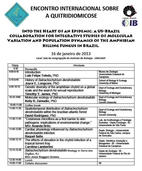 Jan 16, 2013. Today we had the first ever meeting of scientists interested in chytridiomycosis in Brazil at UNICAMP. Approximately 30 scientists were in attendance. Tommy gave an impromptu talk about his thesis project to fill in for Ananda who couldn’t make it.