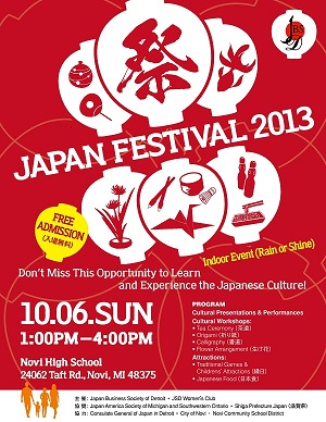 Come to the biggest Japan Festival in all of Michigan! The festival will be held on 10/6 (Sun) at Novi High School.