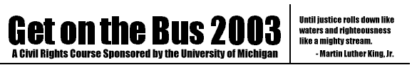 | ANN ARBOR, Mich.- On Thursday, February 20th, thirty University of Michigan students will head south to meet veterans of the American Civil Rights Movement. The course, Get on the Bus 2003, is sponsored by the University of Michigan, the defendant in an affirmative action lawsuit now before the Supreme Court. Students from Get on the Bus 2003 will spend spring break traveling through the south, returning on Sunday, March 2, 2003 in time for classes to begin. Now in its fourth year, Get on the Bus 2003 gives students the chance for a hands-on look at the history of the civil rights movement. This year's trip will make stops in Nashville and Memphis, Tenn., the Mississippi Delta, Selma, Montgomery and Birmingham, Ala., and Atlanta, Ga. In the past, students have met with Coretta Scott King, Congressman John Lewis, Julian Bond, Dr. Bob Moses, and many others. Students have toured the Mississippi State Penitentiary (formerly Parchman Prison Farm), and marched across the Edmund Pettus Bridge in Selma, sight of the infamous Bloody Sunday of 1965. Students also take a three-credit academic course on the history of African-American resistance to racism, offered through the Center for Afro-American and African Studies. After returning, the students will engage in an extended service-learning project, sharing their experiences with the campus community, and teaching the Civil Rights Movement in area schools. Past participants of Get on the Bus 2003 have gone on to work as union organizers in Ohio, campaign strategists for Michigan Governor Jennifer Granholm, and served as interns in areas ranging from a civil rights law firm in the Mississippi Delta, to House and Senate offices in Washington, D.C. Get on the Bus is sponsored by the University of Michigan Center for Afro-American and African Studies. For more information before or at any point during the trip, please contact Jennifer Nathan, Director of Public Relations for Get on the Bus, using the above information. Journalists are welcome to travel with the class. Visit the Get on the Bus website at http://www.umich.edu/~onthebus/ for more information about this and past trips. | |