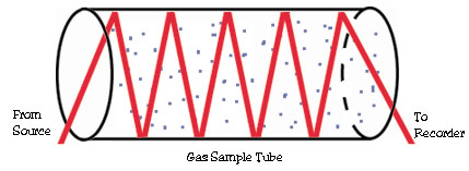 A gas sample is created by allowing the sample to expand into an evacuated cylindrical cell which has special windows than will not absorb the infrared light. The length of the cell can be anywhere from a couple of centimeters to over 10 meters. This cell will be placed in the beam path much like the solid or liquid sample with the exception that gas cell has two windows that the infrared light beam needs to pass through. Because the thermodynamics of the gas are such that it is very spread out the beam is bounced off the inside of the cell so that it will pass through the sample more to get more sample absorbtion.