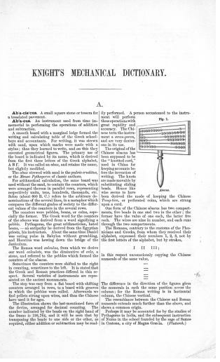 <P>KNIGHT'S AMERICAN MECHANICAL DICTIONARY: BEING A DESCRIPTION OF TOOLS, INSTRUMENTS, MACHINES, PROCESSES, AND ENGINEERING; HISTORY OF INVENTIONS; GENERAL TECHNOLOGICAL VOCABULARY; AND DIGEST OF MECHANICAL APPLICANCES IN SCIENCE AND THE ARTS.</P> <P>BY EDWARD H. KNIGHT, CIVIL AND MECHANICAL ENGINEER, ETC.</P> <P>ILLUSTRATED WITH UPWARDS OF FIVE THOUSAND ENGRAVINGS.</P> <P>VOLUME I. A-FEL.</P> <Q> <L>Thus Time brings all things, one by one, to sight</L> <L>And Skill evolves them into perfect light.</L> <BIBL>LUCRETIUS, Book V.</BIBL> </Q> <P><FIGURE><HEAD>First Steam Engine.</HEAD></FIGURE></P> <P>NEW YORK: PUBLISHED BY HURD AND HOUGHTON. Cambridge: The Riverside Press. 1876.</P> |