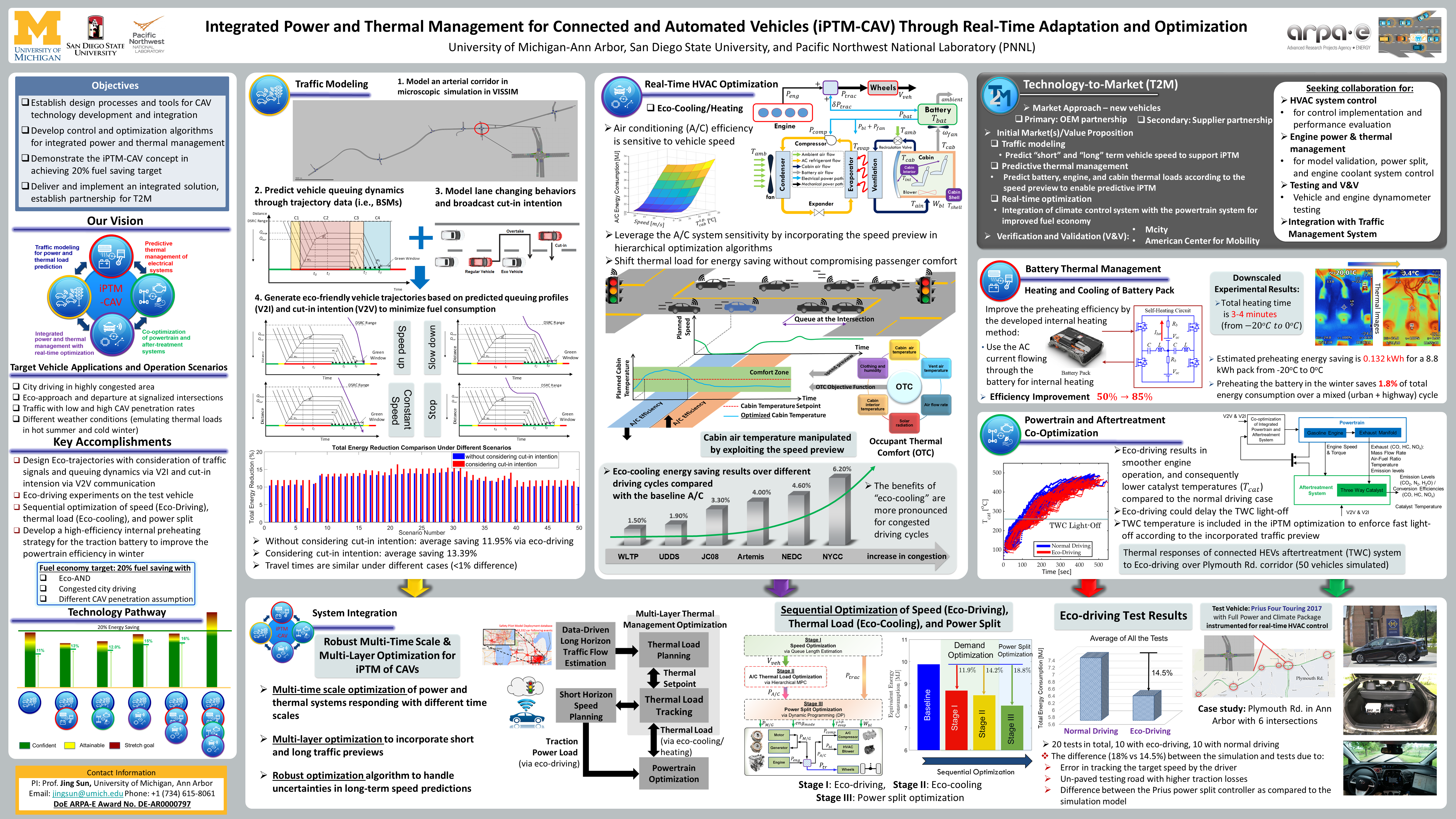 Integrated Power and Thermal Management for Connected and Automated Vehicles (iPTM-CAV) through Real-Time Adaptation and OptimizationCritical Need: Modern drivers are skilled at anticipating and reacting to the behavior of nearby vehicles and the environment in order to travel safely. Nevertheless, all drivers operate with an information gap - a level of uncertainty that limits vehicle energy efficiency. For instance, safe driving demands that drivers leave appropriate space between vehicles and cautiously approach intersections, because one can never fully know the intentions of nearby vehicles or yet unseen traffic conditions. Closing this information gap can enable vehicles to operate in more energy efficient ways. The increased development of connected and automated vehicle systems, currently used mostly for safety and driver convenience, presents new opportunities to improve the energy efficiency of individual vehicles. Onboard sensing and external connectivity using Vehicle-to-Vehicle (V2V), Vehicle-to-Infrastructure (V2I), and Vehicle-to-Everything (V2X) technologies will allow a vehicle to "know" its future operating environment with some degree of certainty, greatly narrowing previous information gaps. By providing the ability to predict driving conditions, these technologies could operate the vehicle powertrain (including the engine, transmission, and other components) more intelligently, generating significant vehicle energy savings. Project Innovation + Advantages: The University of Michigan is developing an integrated power and thermal management system for connected and automated vehicles (iPTM-CAV), with the goal of achieving a 20% improvement in energy consumption. This increase arises from predicting the traffic environment with transportation analytics, optimizing vehicle speed and load profiles with vehicle-to-everything (V2X) communication, coordinating power and thermal control systems with intelligent algorithms, and optimizing powertrain operation in real time. The additional information made available by V2X and new sensors provides a look-ahead preview of traffic conditions unavailable in vehicles without connectivity. This information can be used to enable intelligent decision-making at multiple levels in powertrain and vehicle control. Key to this project is the team's approach for managing vehicle heat loads and thermal management. Thermal loads have to be properly managed, as they affect multiple vehicle attributes including energy consumption, emissions, safety, passenger comfort, etc. Compared to power delivery, thermal loads cannot be served instantaneously - they take more time to respond to changes, making their prediction much more important. The team's proposed technology includes four solutions: managing and optimizing propulsive power and auxiliary thermal load, predictive thermal management of connected and automated vehicles, optimizing powertrain and exhaust aftertreatment systems by anticipating future conditions, and integrating powertrain and vehicle thermal management systems. The proposed strategies are applicable for a range of vehicles powered by internal combustion engines, hybrid-electric, plug-in hybrid-electric, and all-electric powertrains. Potential Impact: The University of Michigan's project enables at least an additional 20% reduction in energy consumption of future connected and automated vehicles.