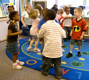 Teachers and students practice words and concepts together, using physical and verbal cues to help children develop listening and speaking skills. Below, a teacher leads her children in a call-and-response exercise.