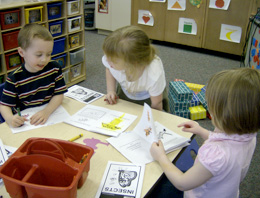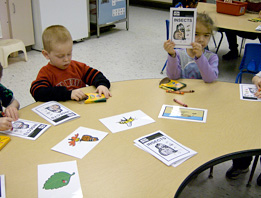 Above, some children are using picture cards to help them decide how to color their take-home books. These cards represent an additional element of the WOW curriculum. In addition to learning new words and concepts, children learn ways to categorize their new knowledge and group new words. Sorting picture cards created a number of unique opportunities for children to use their new words and concepts during circle time as well as free play.