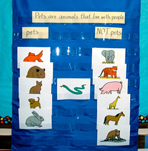 Left: A completed sorting exercise from the Pets category. The snake in the middle represents a "challenge" word. Children were asked to debate whether a snake could be a pet, based on the concepts they learned that define what a pet is. Some felt that a snake could be a pet, others disagreed.
