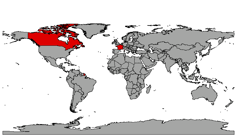 Places that are no longer under French control but are still showing signs of heavy influence are in pink. (you'll have to excuse Canada, I need to find some way to mark only the lower eastern region).