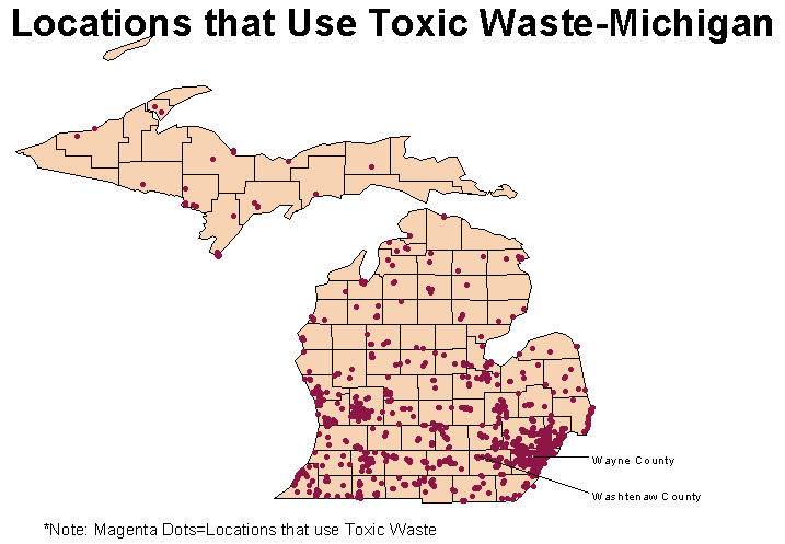In which county are there more facilities that use toxic waste? Why do you think this is so?