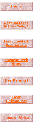 se this site to find out what we did in class, or to check on class assignments and due dates, or to check out some favorite web sites, or to look at a lesson plan, or to let us know how class is working for you, your child, or your own classroom.