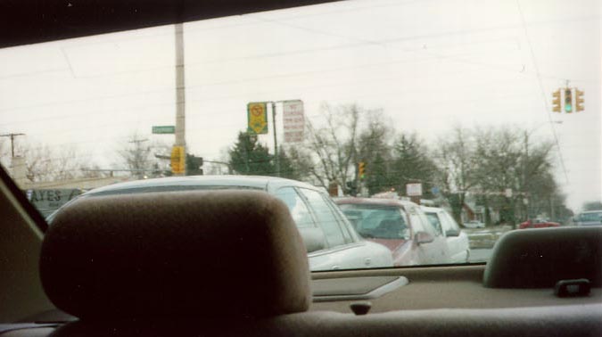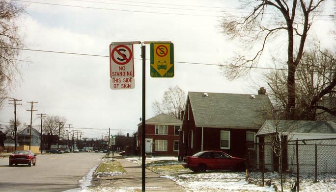 Bus stop sign at St. Patrick and Gunston, and parked cars in front of a bus stop at Hays and Majerledge