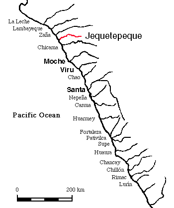 During the Formative Period, human settlements began to move inland (Moseley 1992). This pattern was reflected by archaeological surveys, which showed that Formative sites were located further inland as compared to the earlier Preceramic sites. The shift in settlement distribution probably resulted from greater reliance on cultivated plants and irrigation systems that operated most optimally in mid- or upper valley.Click on the Moche, Viru, Santa, or Jequetepeque valley to show more detailed settlement data.
