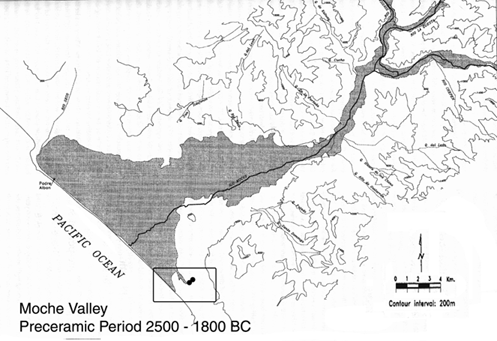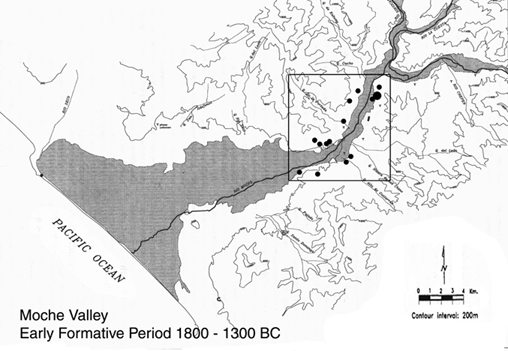 Source: Billman, Brian. (1996) The Evolution of Prehistoric Political Organizations in the Moche Valley, Peru. Unpublished Ph.D. Dissertation. Department of Anthropology, University of California, Santa Barbara.Bill, Brian R. (1999) Reconstructing Prehistoric Political Economies and Cycles of Political Power in the Moche Valley, Peru. In Settlement Pattern Studies in the Americas: Fifty Years Since Virú, edited by B. R. Billman and G. M. Feinman, pp.131-159. Smithsonian Institution Press: Washington D.C.