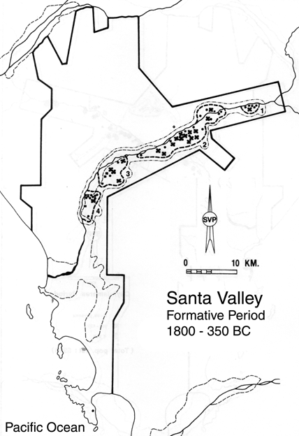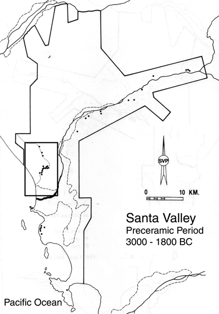 Source: Wilson, David J. (1988) Prehispanic Settlement Patterns in the Lower Santa Valley, Peru. Smithsonian Institution Press: Washington D.C.David Wilson spent a total of 9 months conducting systematic field survey of the Santa Valley during the years 1979 and 1980. Sites were recorded on aerial photos during the field survey, and then drawn onto a large sheet of Albanene tracing paper. Longitude/latitude information regarding the sites was not given in his book.During the Preceramic Period (or Las Salinas Period in the local Santa chronology), sites are distributed throughout the valley, from the shore to inland. There is a cluster of 12 sites concentrated along the preceramic shoreline, which is demarcated by the dashed lines.