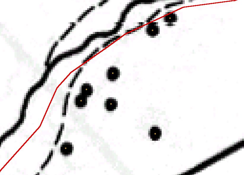 The rectified image overlapping the registered map. The large black dots are the sites on the rectified image, and the small brown dots (in the center of the black dots) are the new points I created on the registered map. The red line is river on the registered map, which is about 0.63 km south of the actual river on the recitified image, as represented by the thicker black line.