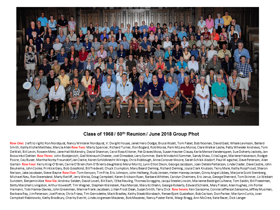 20180615-1800-Class Photo-1756 Bill Freedman Dave Peterson, Tom Saldin, Cilla Cogan, Marty Ratliff, Lynn Elliott, Marilyn Curtis, Marianne Baldrige, Patty Wheeler, Susan Hawker, Linda Jorgensen, Will Levin, Tim Wegner, Paul Menzel, Rudy Jensen, Tom DeWall, Mike Reuling, John Hallberg, Ron Steensland, Kay & George Sherrard - arriving for class photo (6/15/2018) |