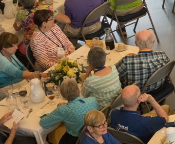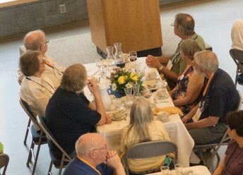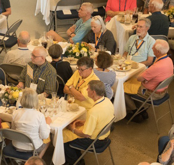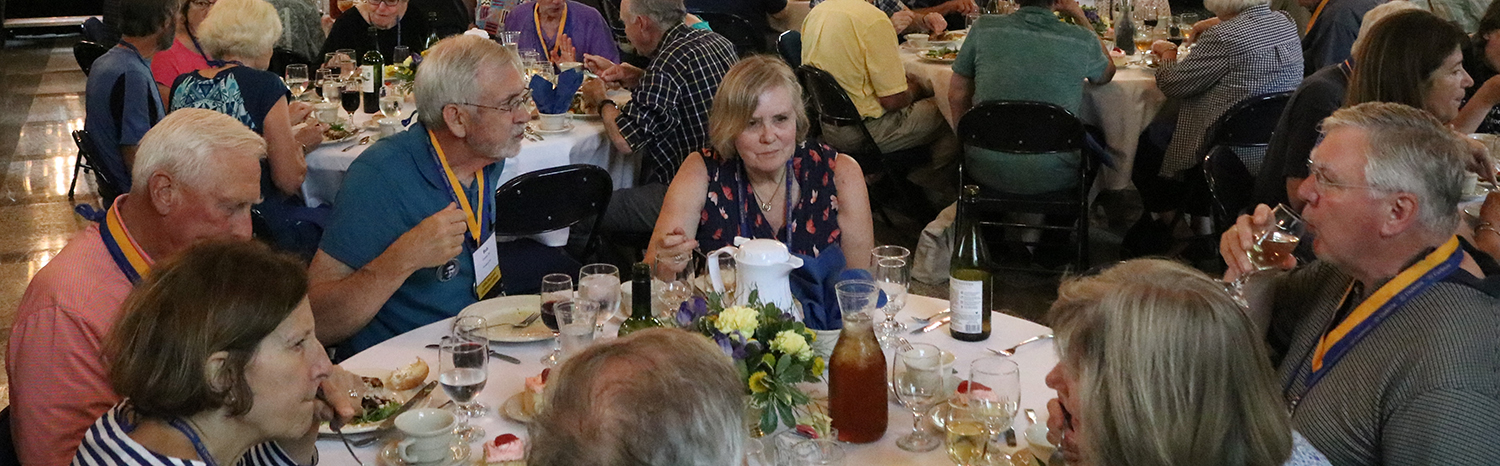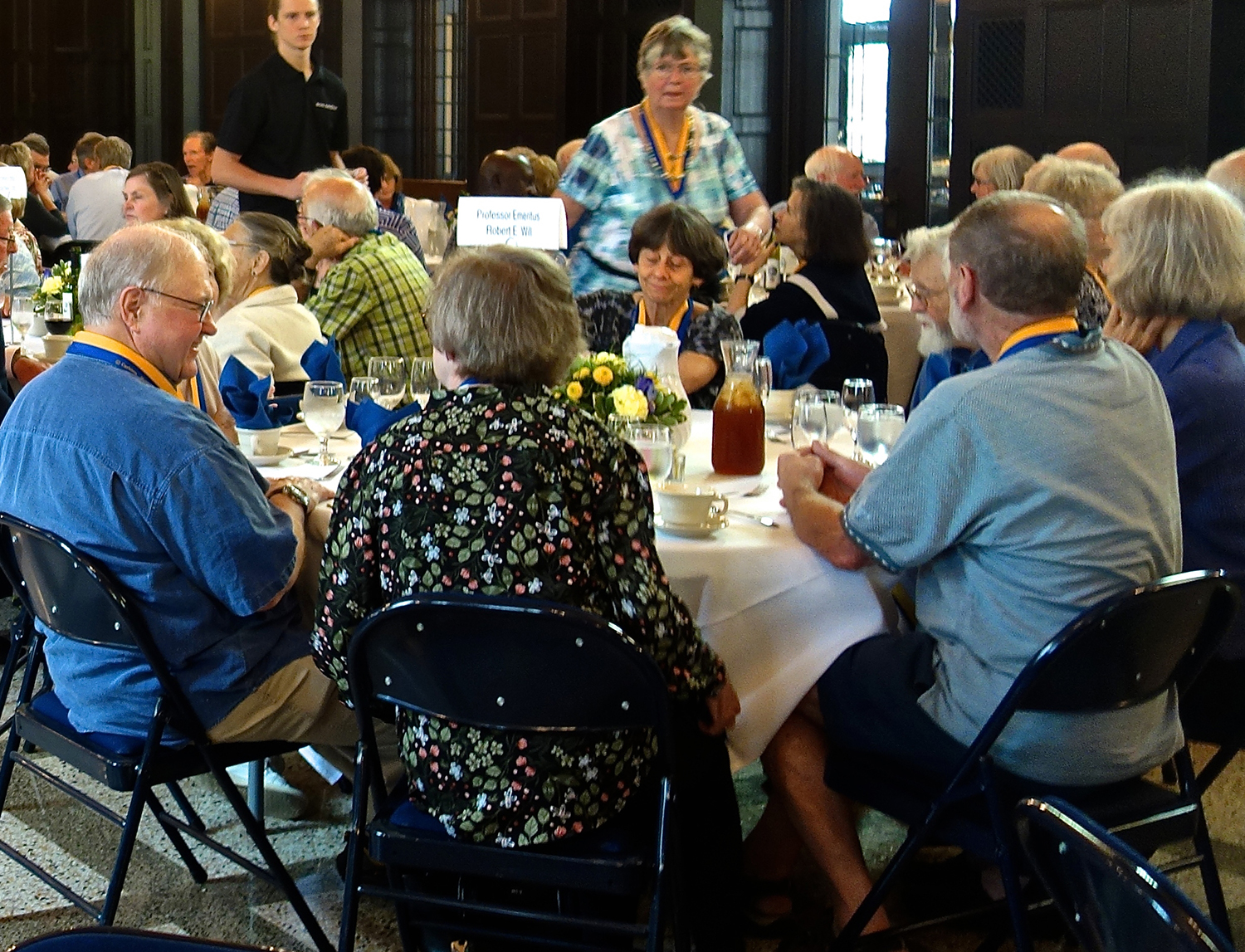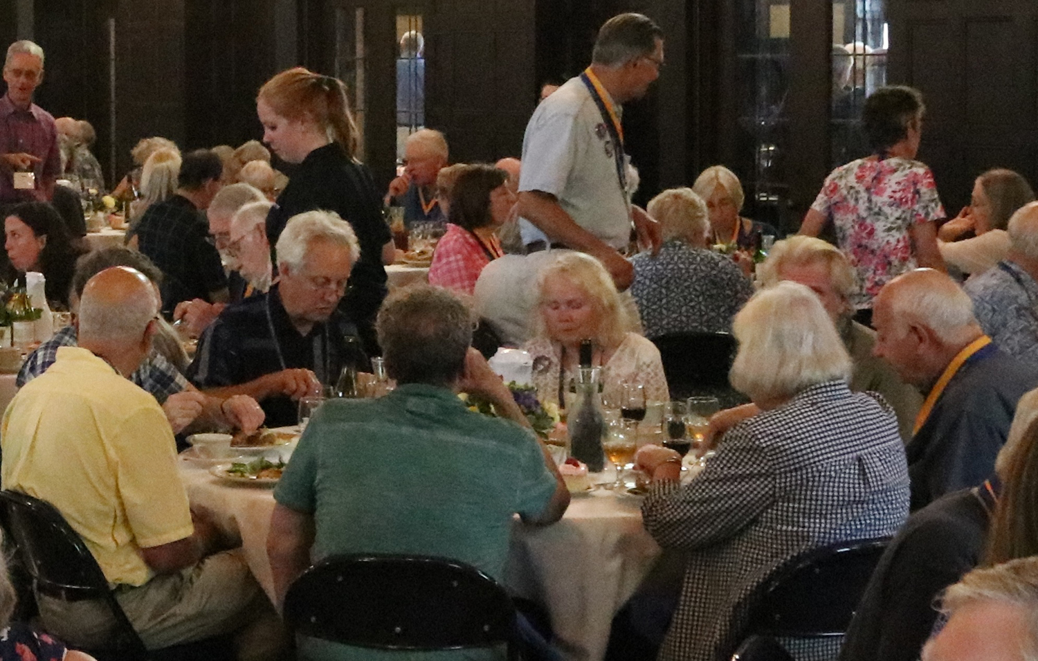 20180615-1830-Dinner-1852D George Roberts, Ed Schlenk, Richard Turner, Marty Spencer, John Bostjancich, Pat Graves, Walter Dean '67 (Lillian Frost Dean's husband), Roger Forsberg '67, Lillian Frost, Professor Emeritus Lauren & Nancy Soth, Kathy Klobe & David Matthew - tables at Friday night dinner (6/16/2018) |