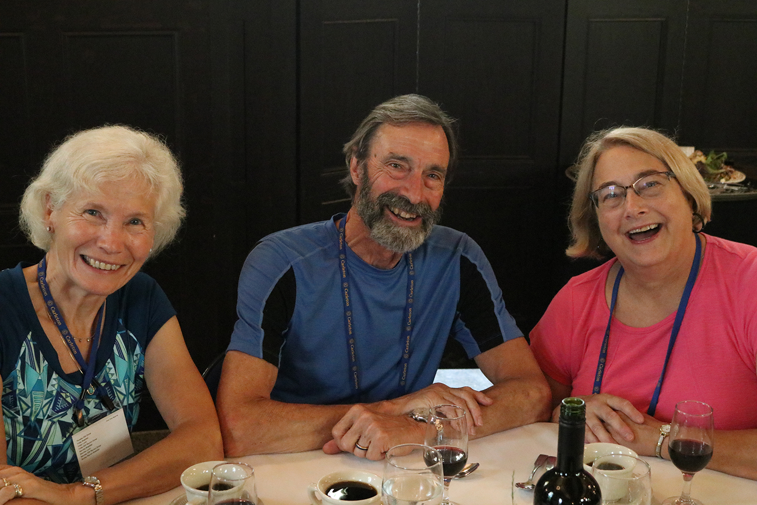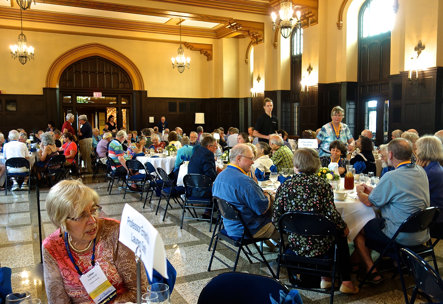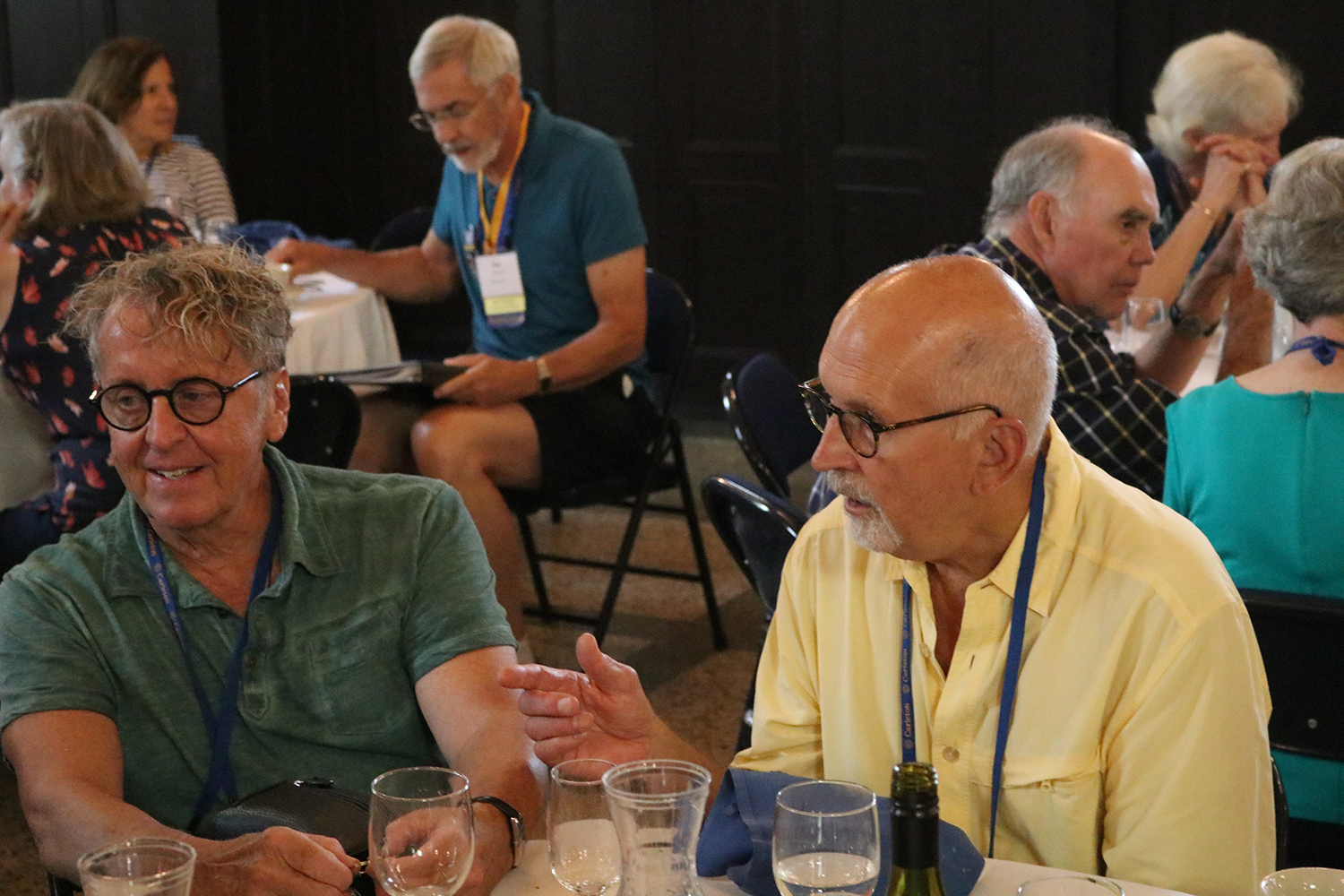 20180615-1830-Dinner-1852D George Roberts, Ed Schlenk, Richard Turner, Marty Spencer, John Bostjancich, Pat Graves, Walter Dean '67 (Lillian Frost Dean's husband), Roger Forsberg '67, Lillian Frost, Professor Emeritus Lauren & Nancy Soth, Kathy Klobe & David Matthew - tables at Friday night dinner (6/16/2018) |