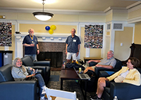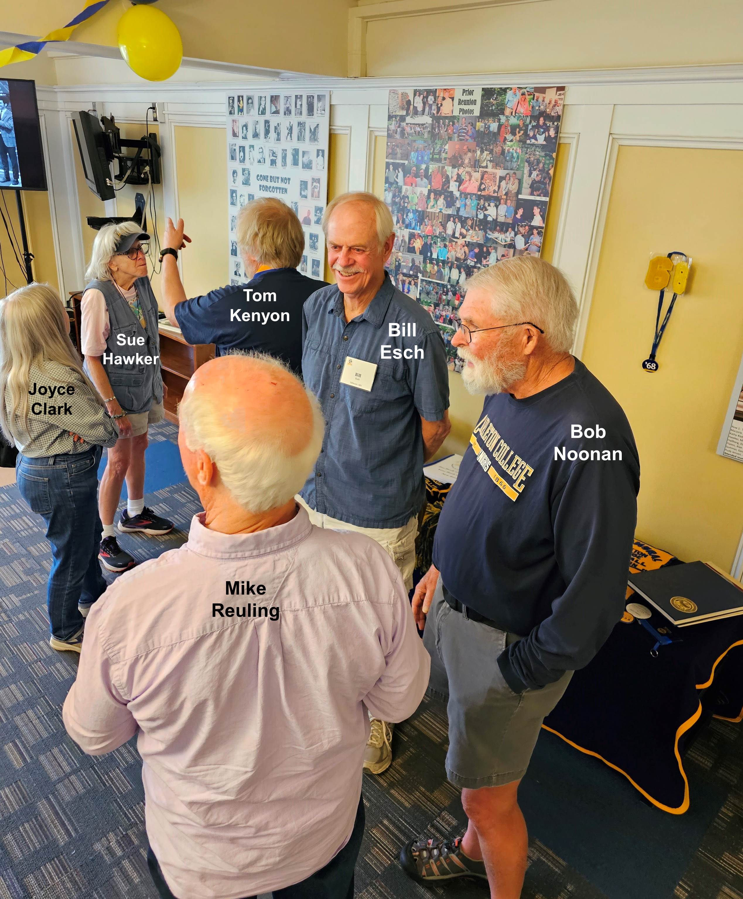 2023-55R-0011M L to R: Joyce Clark (sitting, holding reunion program), Tom Kenyon (standing, holding cup containing Diet Pepsi), Bill Esch (standing with arms at sides), Steve Bayne (sitting, wearing horizontally-striped shirt), Sharon Grayden (Steve Bayne's wife, sitting wearing yellow shirt) - Thursday afternoon in Nourse lounge (6/15/2023) |