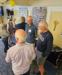 2023-55R-0012 Clockwise from upper left: Joyce Clark (wearing blue jeans), Sue Hawker (wearing vest), Tom Kenyon (back to camera with left arm in air), Bill Esch (name tag visible), Bob Noonan (wearing CC sweatshirt), Mike Reuling (foreground with back to camera) - Thursday afternoon in Nourse lounge (6/15/2023) |