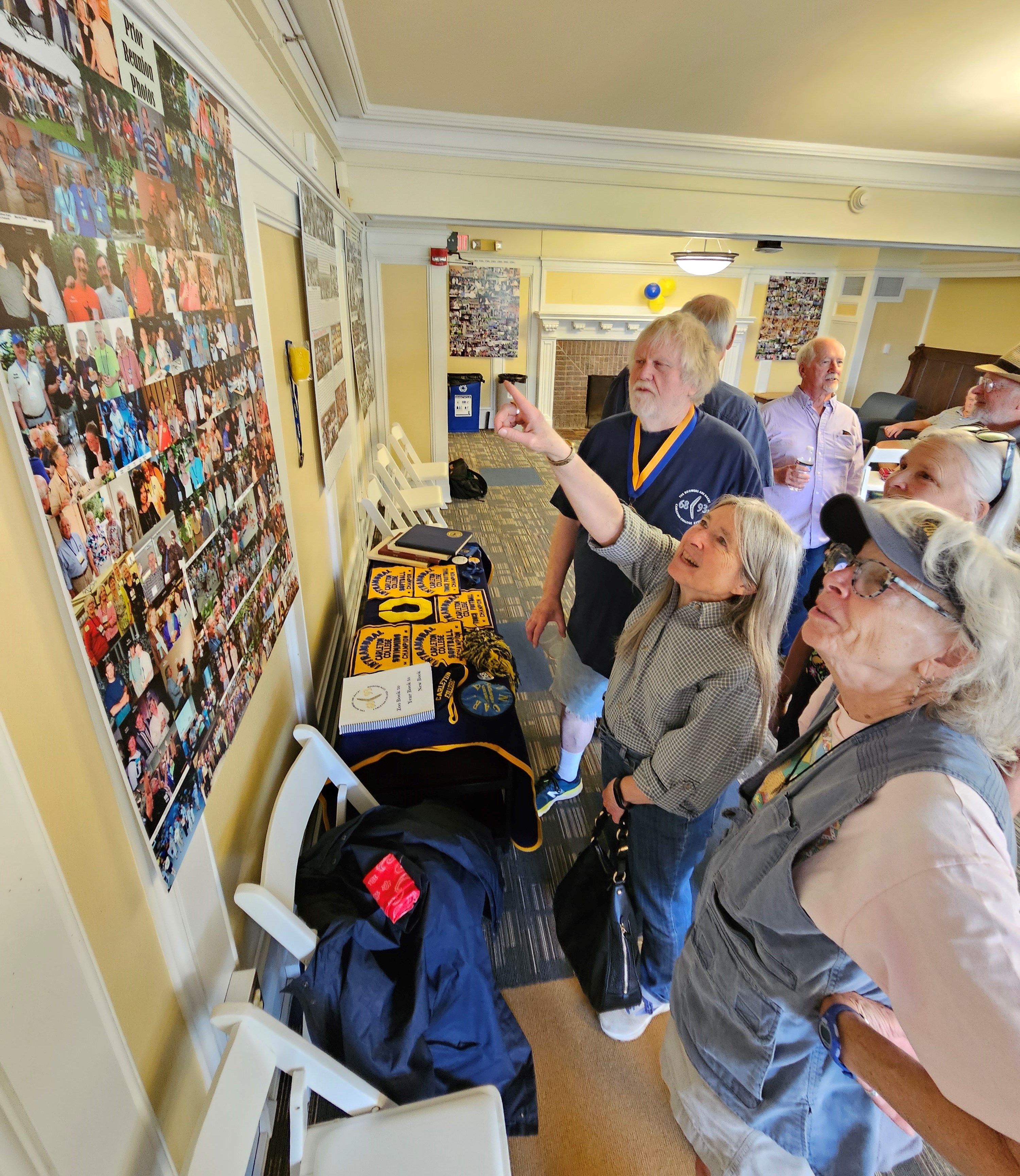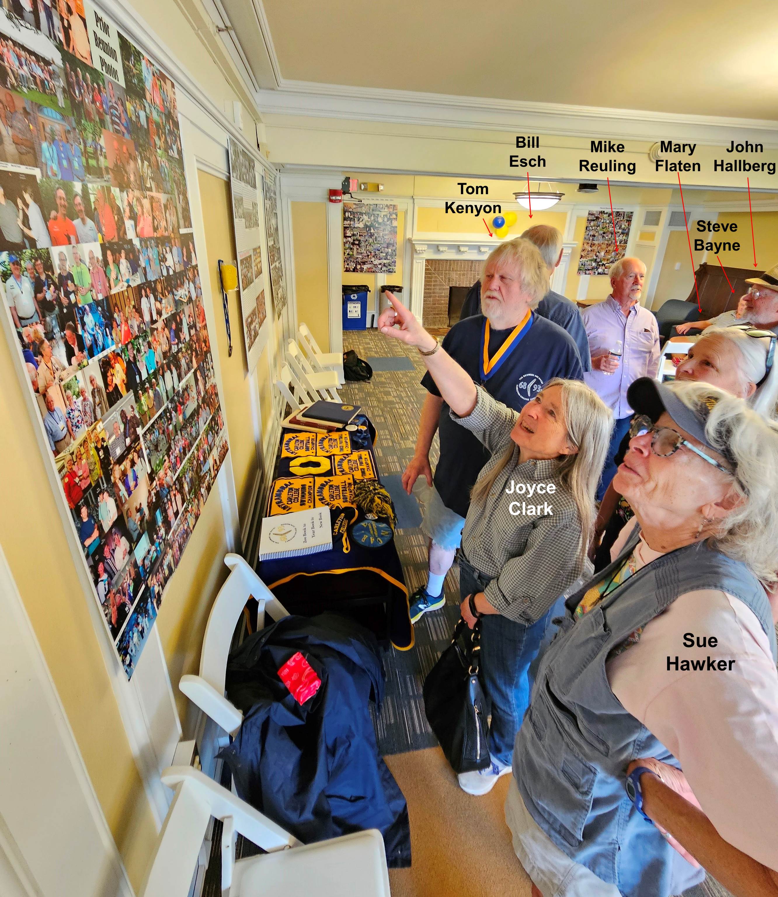 2023-55R-0013 F to B, L to R: Sue Hawker (wearing visor), Joyce Clark (pointing at photo), Mary Flaten (top of head only, behind Sue), Tom Kenyon (wearing dark blue t-shirt), Bill Esch (back to camera, just below ceiling light), Mike Reuling (wearing light-purple shirt), John Hallberg (wearing hat), Steve Bayne (partially visible sitting on couch) - Thursday afternoon in Nourse lounge (6/15/2023) |
