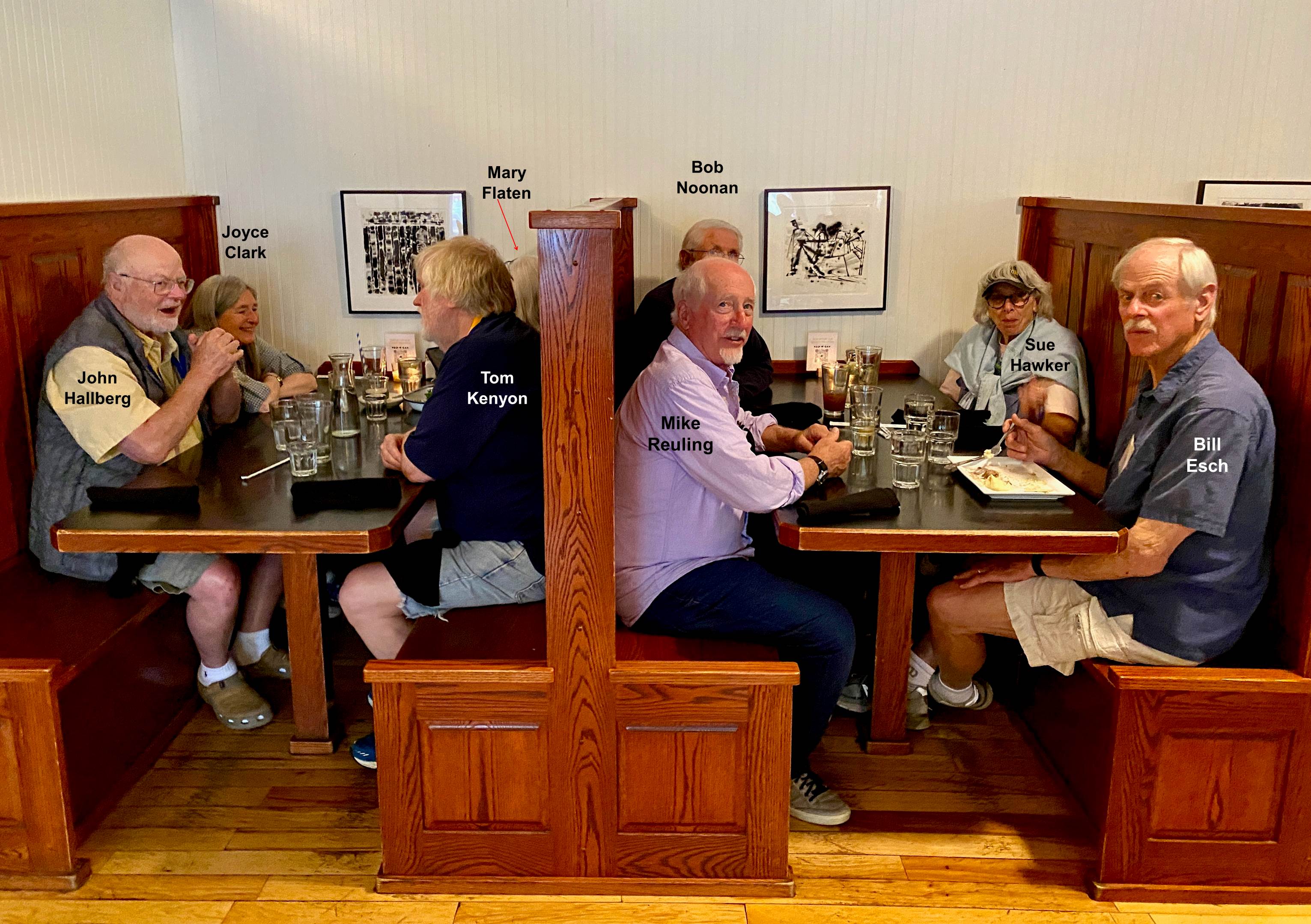 2023-55R-0014 L to R: John Hallberg (wearing yellow shirt), Joyce Clark (behind John), Tom Kenyon (wearing dark-blue t-shirt), Mary Flaten (behind Tom with part of head visible), Mike Reuling (wearing light-purple colored shirt), Bob Noonan (partially visible, behind Mike), Sue Hawker (wearing visor), Bill Esch (holding fork in right hand) - some Thursday arriving classmates 5:30 p.m. Thursday dinner at Ole Store (6/15/2023) |