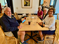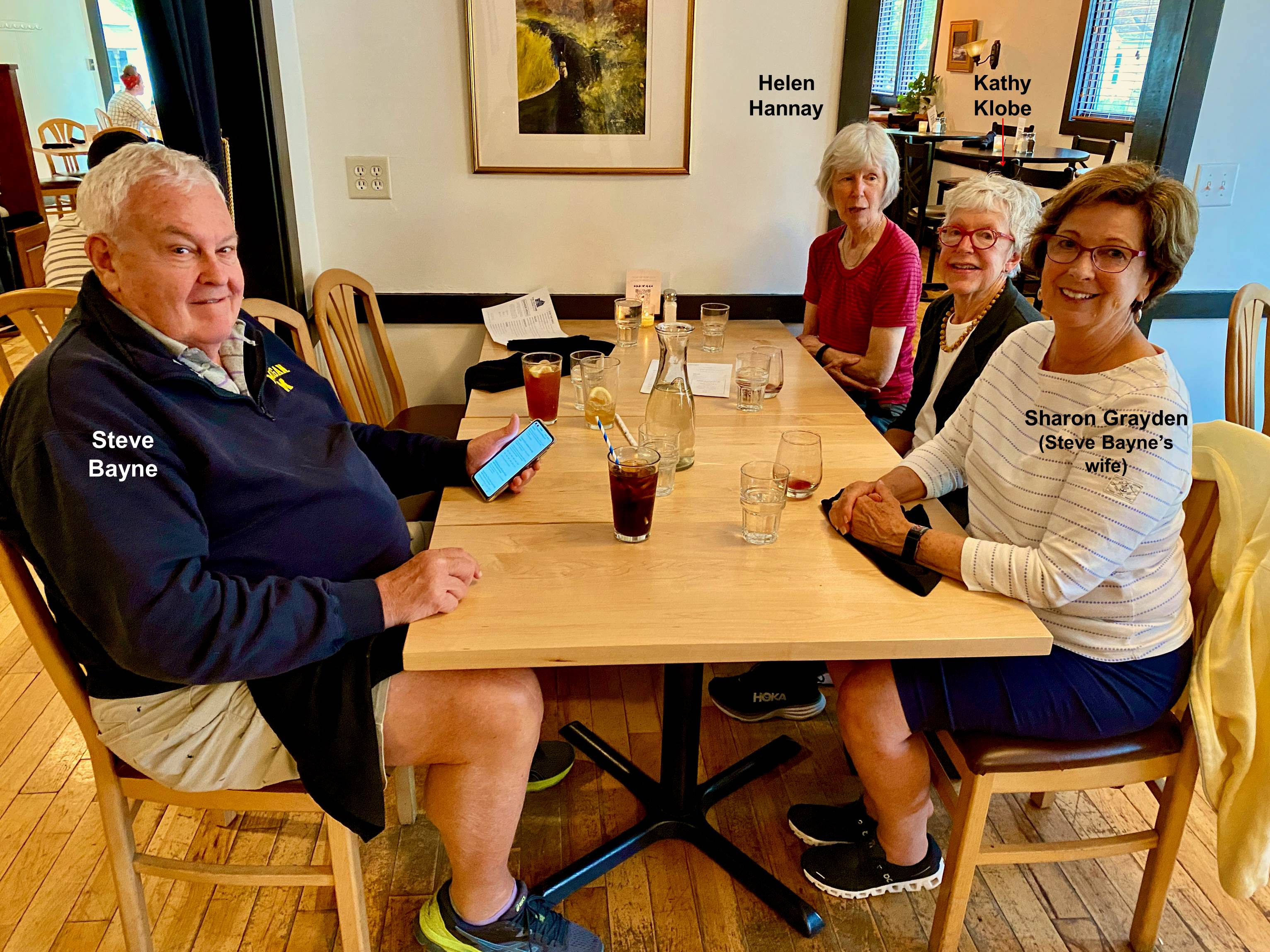 2023-55R-0015 L to R: Steve Bayne (holding smartphone), Helen Hannay (wearing red shirt), Kathy Klobe (wearing necklace), Sharon Grayden (Steve Bayne's wife, wearing white shirt with horizontal stripes) - some Thursday arriving classmates 5:30 p.m. Thursday dinner at Ole Store (6/15/2023) |