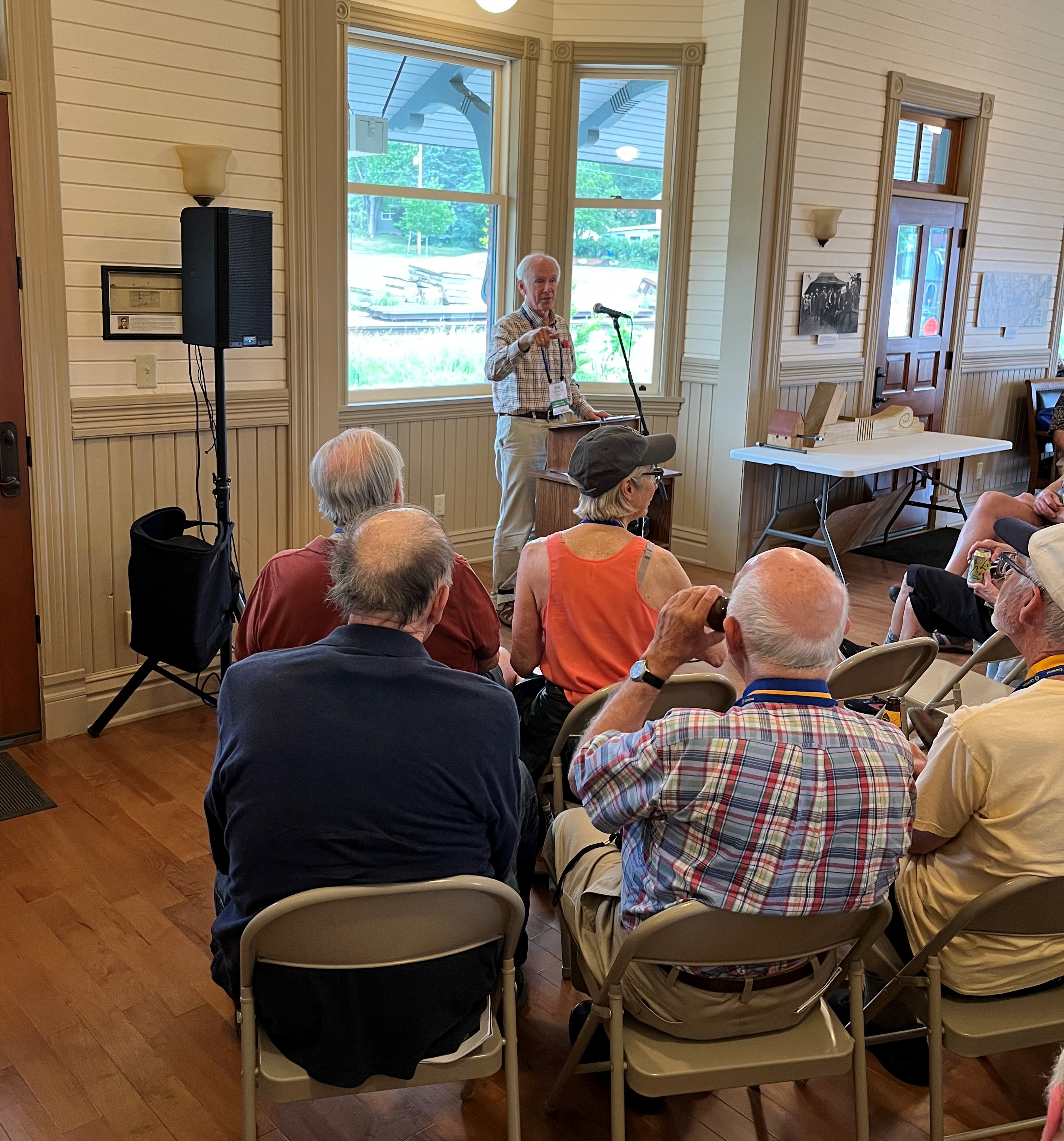 2023-55R-0128 Eric Johnson at the podium. Front row L to R: Sue Hawker (wearing white shirt), Joyce Clark (long hair), Bob Noonan (wearing black shirt). 2nd row L to R: John Cooke (left end), Ann McCree (wearing horizontally-striped shirt), Karen Erickson (hair in ponytail), Joel Dimsdale (wearing dark blue shirt), Jan Clarke (side of back of head and shoulder visible, wearing yellow shirt with sunglasses on top of head). 3rd row L to R: Mike Reuling (wearing baseball cap), Mary Flaten (wearing multi-colored shirt), Meryl Moritz (wearing black outfit), Sharon Grayden (Steve Bayne's wife, wearing blue & white shirt), Steve Bayne (wearing dark-blue shirt). 4th row (far right): Tom Fabel (wearing green shirt), Sharon Nelson (wearing light-blue patterned shirt). L to R on bench against back right wall: Jake Jacobsen (wearing dark-blue with white pattern shirt), Marnie Frank (wearing multi-colored shirt), Harriet Freedman (wearing horizontally-striped shirt) - 5 p.m. Saturday reception at old Northfield train depot (6/17/2023) |