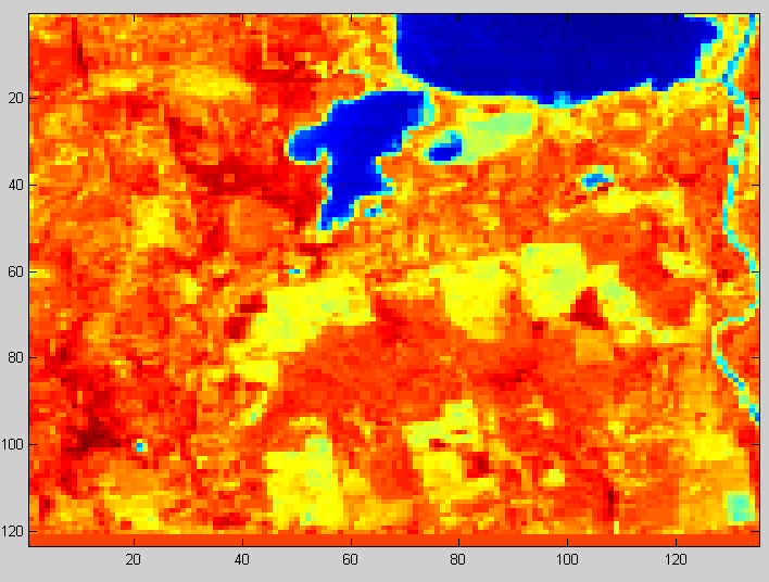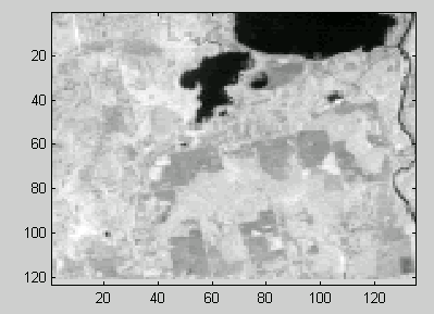 A computed NDVI array for the TM data was then inputted into an algorithm that produces graymaps. This was done with the help of Adam Thodey (a fellow College of Engineering graduate student). The resulting NDVI graymap can be seen as Figure 3.