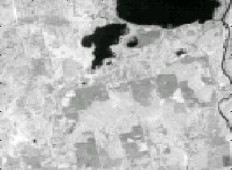 The three fairly dark gray areas within the perimeter of Stinchfield Woods, although not perfectly represented on the graymap, actually correspond to NDVI values closer to zero: in other words, areas of less "greenness." These areas when field checked proved to be gravel pits. The darkest area found around R93C42 is an active gravel pit, privately run. A slightly larger gravel pit, but apparently not recently active, is represented by the gray pixels around R106C97. Lastly, a small gravel pit that is in use and no more than 30 meters across shows up as one dark gray pixel among a conifer forest at about R60C97. All three of these areas are bordered by vegetative growth which would increase there pixel average.