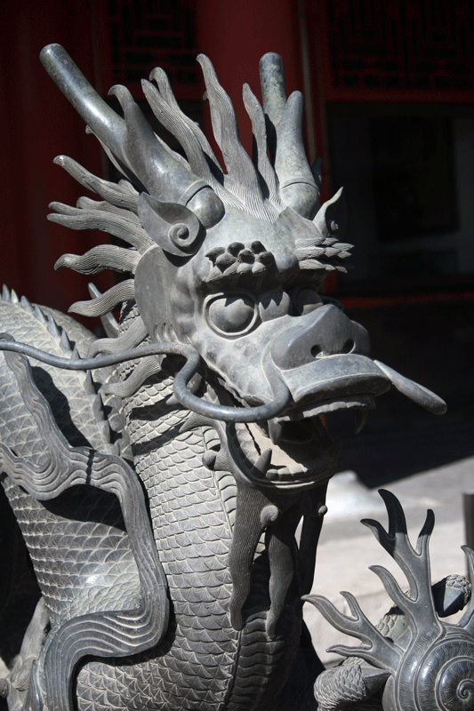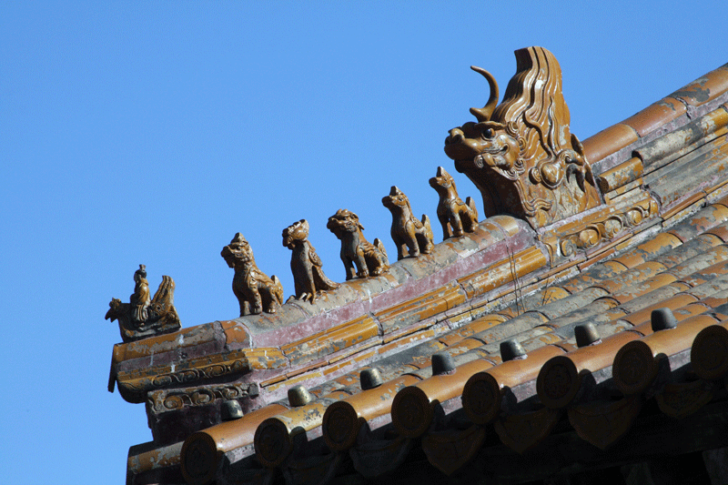 | The sloping ridges of building roofs are decorated with a line of statuettes lead by a man riding a phoenix (personally, I think it is a chicken - the phoenix represents the Empress and I am not too sure the Emperor would want someone riding her) and followed by an imperial dragon. The number of statuettes represents the status of the building — a minor building might have 3 or 5. The Hall of Supreme Harmony has 10, the only building in the country to be permitted this in Imperial times. As a result, its 10th statuette, called a "Hangshi", or "ranked tenth" is also unique in the Forbidden City. | ![]() |