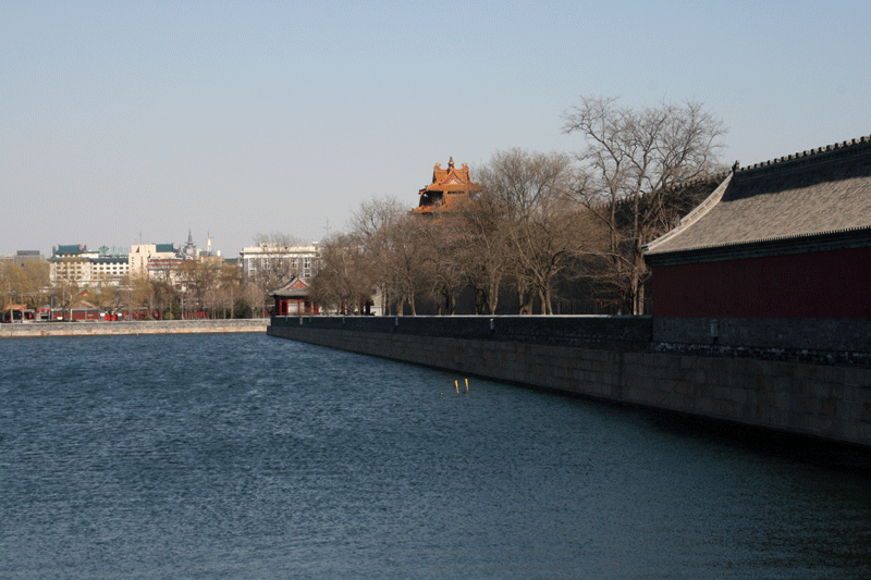 | The Forbidden City is surrounded by a 7.9 meters (26 ft) high city wall and a six-meter deep, 52 meters (171 ft) wide moat. The walls are 8.62 meters (28.3 ft) wide at the base, tapering to 6.66 meters (21.9 ft) at the top. | ![]() |