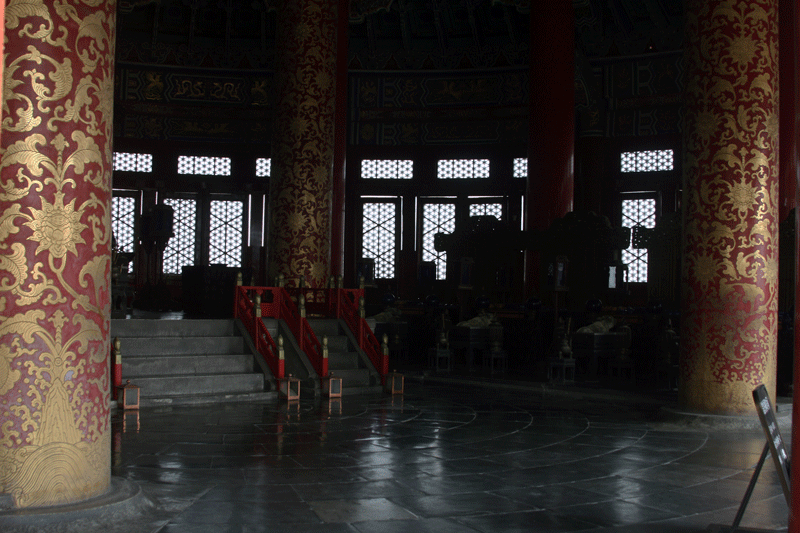 | Inside the Hall are 28 tall pillars, each made from a single tree trunk. The four posts around the inner circle represent the four seasons. The 12 posts around the middle circle represent the 12 months. The 12 posts of the outer circle represent 12 ShiChen. In ancient China, one ShiChen equalled two hours so that a complete day was divided into 12 ShiChens. | ![]() |