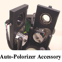 We also have an auto-polarizer accessory. This accessory can rotate the position of the excitation and emission polarizers via stepper motors under data system control. This accessory enables one to do automatic anisotropy measurements on solutions. |