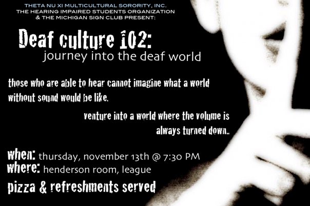 - November 19 - Deaf Culture 101: Enter the Silent World with The Hearing Impaired Student Organization, The Michigan Sign Club, Delta Tau Lambda Sorority, Inc. and Lambda Theta Phi Latin Fraternity, Inc.