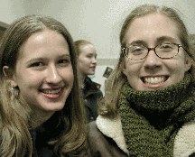 Mara Terwilliger and Christina Quillan, bundled up for the trek back to their room at Betsy Barbour after a UCO prayer meeting