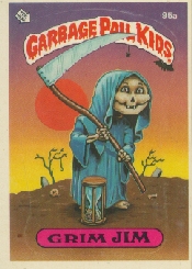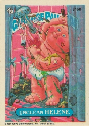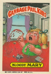 Another example is the Topps' Garbage Pail Kids trading cards of the 1980s. They parodied Mattel's Cabbage Patch Kids dolls by mutilating and transforming their images grotesquely. They address children's fears of physical abnormality, supernatural beings, personal bodily harm, and dangerous animals. The cards also demonstrated cultural taboos like nose-picking, public spitting, improper personal hygiene, abnormal body weight, hickies, and women's absence of shaving.