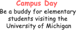 Campus Day brings young students to UM for a day of exploration and excitement. With University Buddies, the children tour campus, engage in hands-on activities and do lots of talking. A Buddy answers questions, provides information about UM and college in general, assists with the activities and has fun with the students. As a Buddy, you will spend a planned day in the Spring with 2 or 3 elementary school students. You are expected to participate for the entire day (from approx. 9-3). Past Schedule: 8:30-9:30: Registration & Orientation for volunteers 9:30-10:30: Kids arrive, guest speaker & pairing with buddies 10:40-11:10: Activity 1 11:20-11:50: Tour of Central Campus 12:00-12:30: Activity 2 12:30-1:30: Lunch 1:30-2:00: Athletic campus tour 2:00-3:00: Kids depart and UM students participate in reflection/wrap-up Reactions to Campus Days: "My trip to the University was the best class trip I ever took." Elementary student