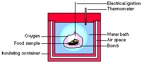 | Figure 1. A bomb calorimeter is used to determine calories in food. A piece of food is placed inside the chamber, which is then charged with oxygen. A fuse and an electric current are used to ignite the food-oxygen mixture. As food burns, the heat liberated is absorbed by a water jacket surrounding the bomb. Because the calorimeter is fully insulated from the outside environment, any increase in water temperature directly reflects the heat liberated during the burning of the specific food nutrient. |